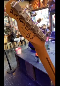In a first step on creating new experiences, Buck is back to performing on Nashville’s lower Broadway (which is in throwing distance of the bombing area) playing a guitar with a special message written on it “Buck, Twang on pal! Glad you’re still here. Brad”